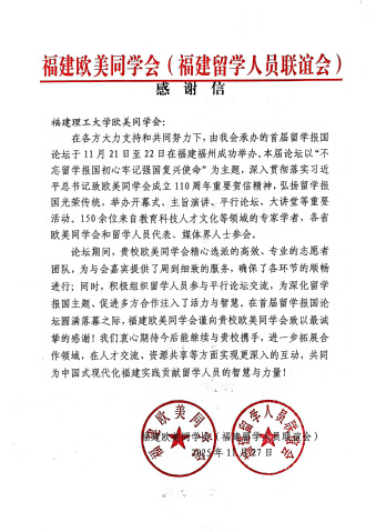 近日,福建省欧美同学会(福建留学人员联谊会)向我校发来感谢信,对我校欧美同学会在首届留学报国论坛中的全力协助表示衷心感谢。